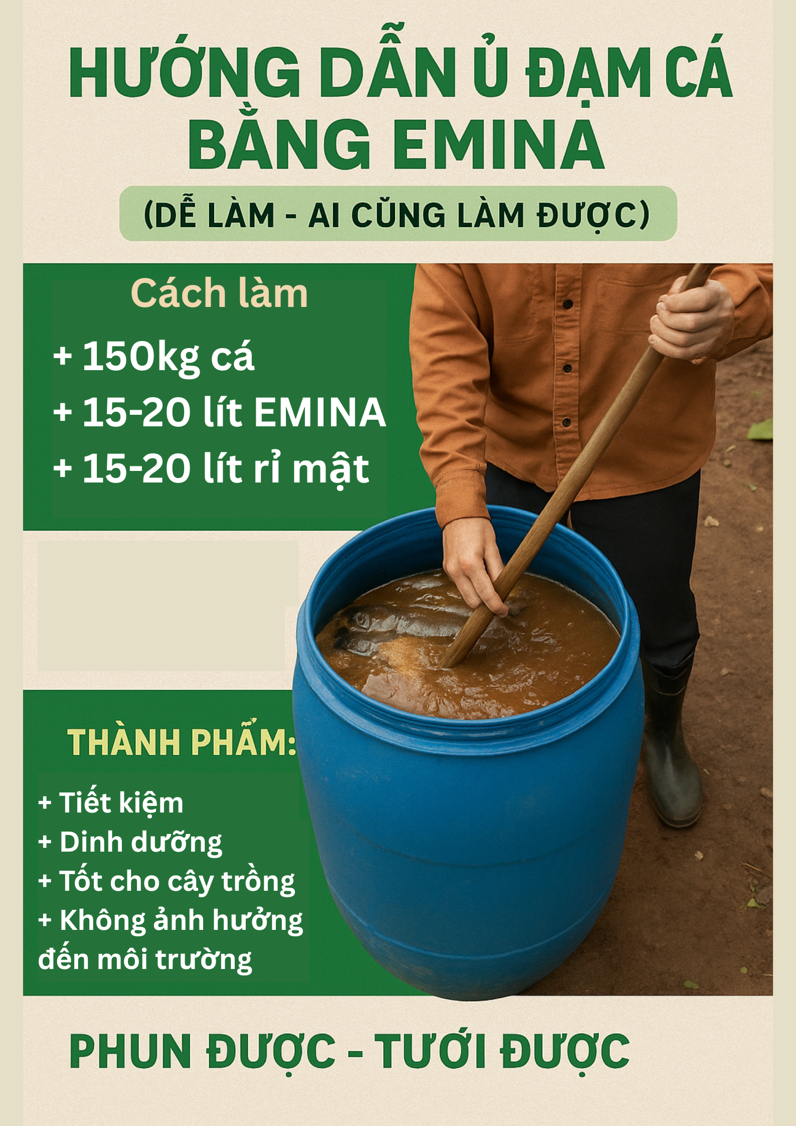 Ủ đạm cá bằng EMINA là cách đơn giản nhất để tạo nguồn dinh dưỡng sạch – an toàn – hiệu quả cho cả vườn.Ai cũng có thể làm, và chỉ sau 20–30 ngày bạn sẽ có “siêu phân hữu cơ” dùng cho cả năm.
