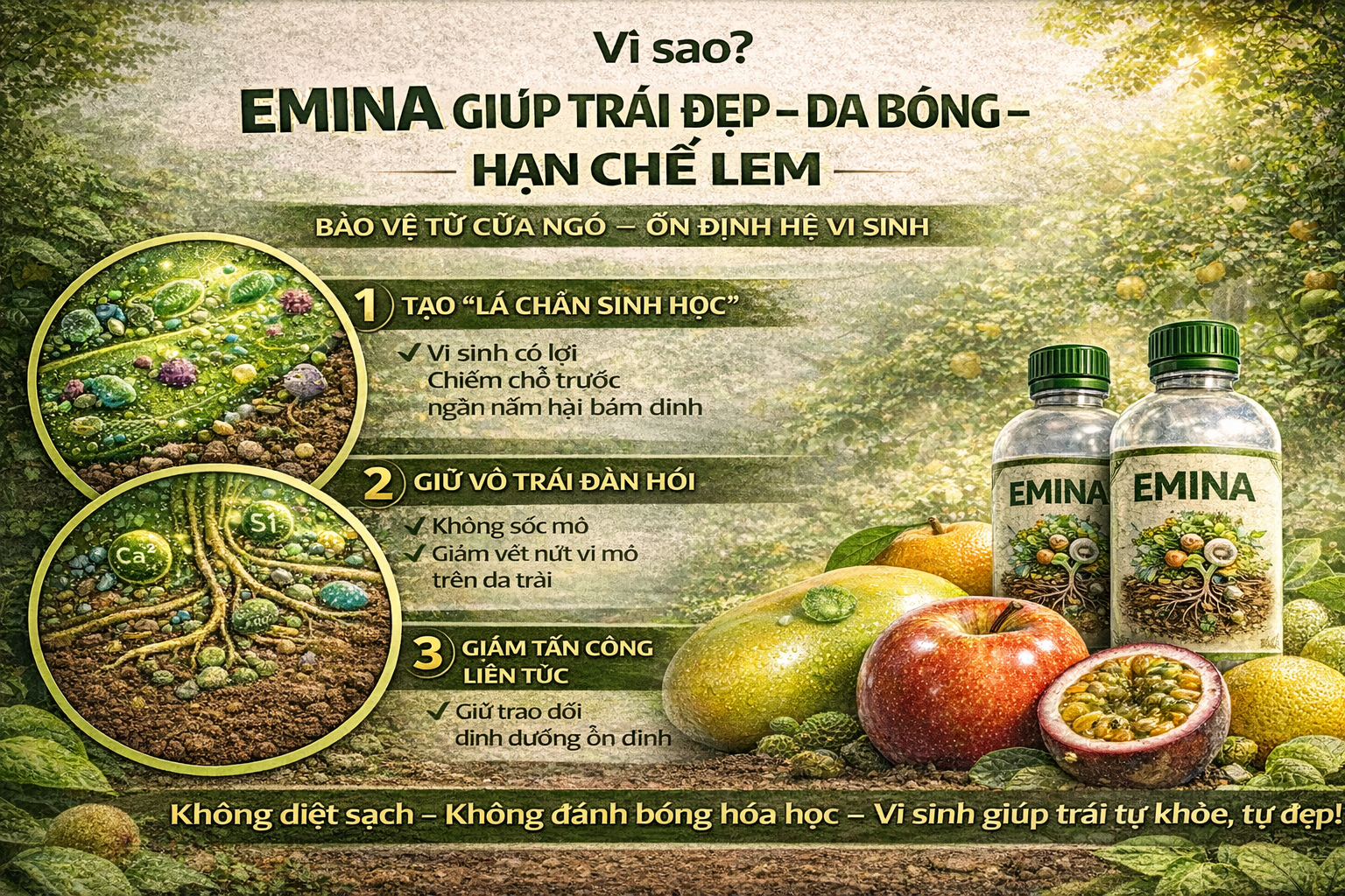 EMINA không làm đẹp trái trong 1 lần phun.EMINA giúp cả hệ sinh thái quanh trái ổn định để trái tự đẹp.
